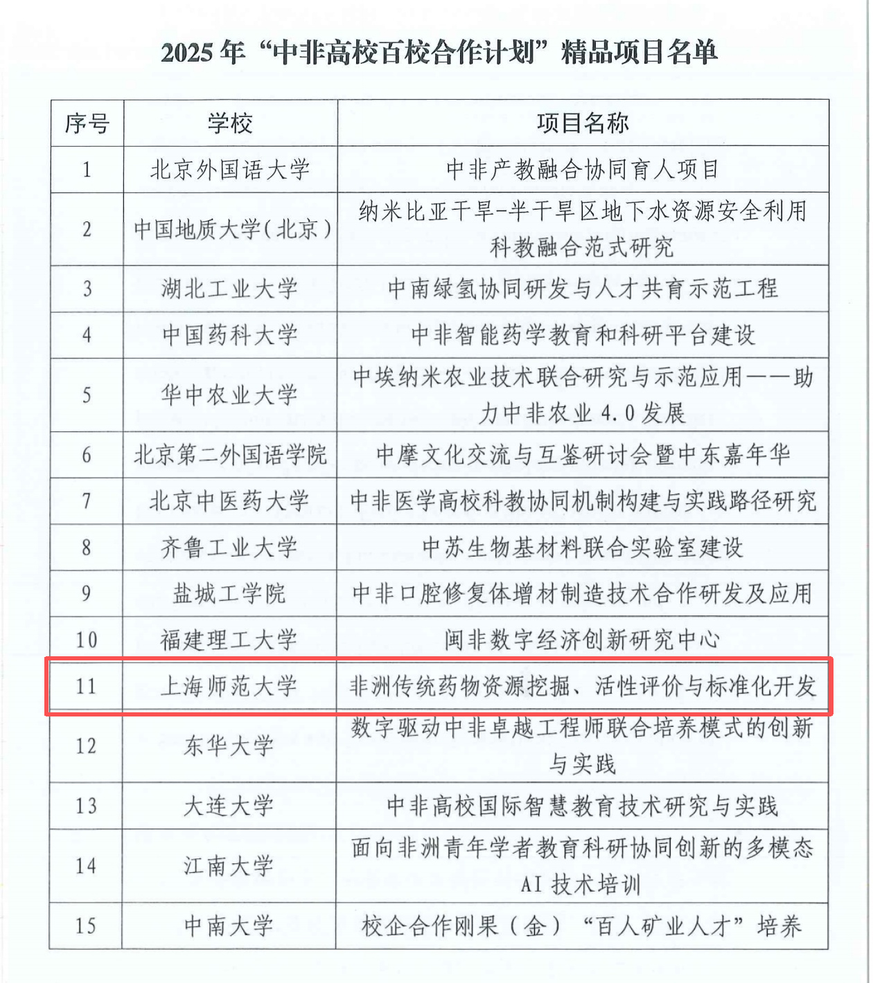 近日,中国高等教育学会公布了2025年度“中非高校百校合作计划”精品项目评审结果,全国共遴选出15项优秀项目。我院曹建国教授团队申报的“非洲传统药物资源挖掘、活性评价与标准化开发”项目成功入选,并获得专项经费支持。