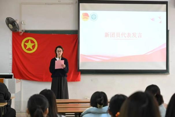 来自2024级生物科学专业新团员代表钟依凡同学在发言中不仅表达对加入团组织的激动与自豪,更倡导大家要铭记入团誓言,坚定理想信念,努力学习、积极实践,以优秀团员标准时刻严格要求自己,让青春在全面建设社会主义现代化的实践中绽放绚丽之花。