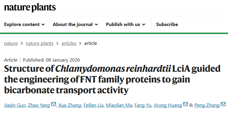 2026年1月8日,Nature Plants在线发表了ok138太阳集团黄继荣研究组与中国科学院分子植物科学卓越创新中心张鹏研究组合作完成的题为“Structure ofChlamydomonas reinhardtii LciA guided the engineering of FNT family proteins to gain bicarbonate transport activity”的研究论文。研究揭示了莱茵衣藻CO2浓缩机制CCM中HCO3⁻转运通道LciA的底物选择性机制,并通过结构指导的分子设计,成功实现HCO₃⁻转运活性的理性改造,为利用CCM改造C3作物提升光合效率提供了核心元件与分子策略。