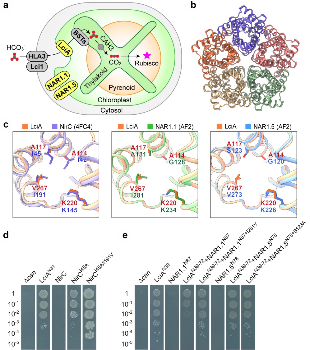 研究团队通过冷冻电镜技术解析了LciA蛋白的高分辨率三维结构,首次揭示其选择性识别底物HCO3⁻的关键机制:Lys220通过静电作用精准捕获带负电的HCO3⁻,而Ala117与Val267形成空间约束,协同确保了底物的高特异性。进一步实验表明,K136A与A114F位点突变可显著增强LciA的HCO3⁻转运活性,验证了结构分析的准确性。基于这一结构蓝图,研究团队对LciA所属的FNT(formate/nitrate transporter)及NAR1(nitrate assimilation-related component 1)家族成员展开理性设计:一方面,成功将细菌亚硝酸盐通道NirC改造为具有HCO3⁻转运活性的新型元件;另一方面,发现莱茵衣藻定位于叶绿体膜的NAR1.1和NAR1.5具有HCO3⁻转运活力,并且通过位点优化后可实现了NAR1.1的HCO3⁻转运活性的显著提升。这些研究成果不仅破解了真核生物CCM中底物无机碳识别与转运的分子机制,而且实现了以结构为基础的HCO3⁻转运活性的理性设计与分子改造,为利用CCM改造C3作物提升光合效率提供了核心元件与分子策略。未来有望通过基因编辑技术将这些高效转运元件导入C3作物,在不增加施肥的前提下提升光合作用效率,为保障粮食安全提供科技支撑。