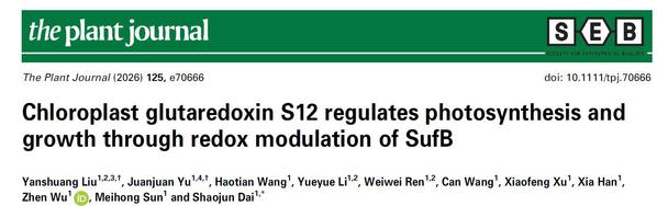 2026年1月21日,戴绍军教授团队在The Plant Journal发表题为Chloroplast Glutaredoxin S12 Regulates Photosynthesis and Growth through Redox Modulation of SufB的研究论文,揭示了植物叶绿体谷氧还蛋白GrxS12通过调节SufB氧化还原调控光合作用与植物生长。