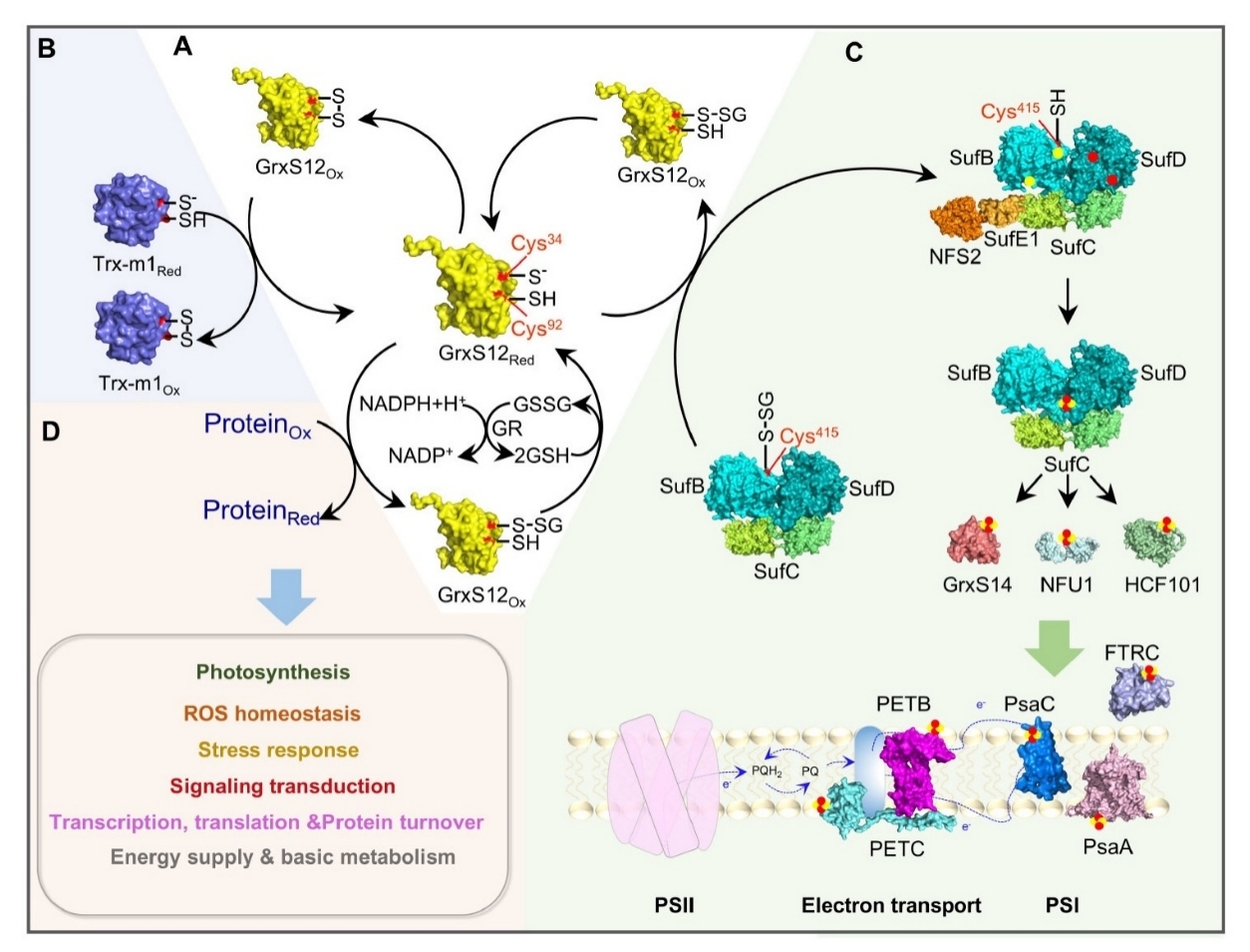 该研究以拟南芥为材料,发现缺失GrxS12会导致植株生长迟缓、叶绿体结构异常以及光合作用效率下降,而GrxS12过表达或互补表达可恢复上述表型。进一步研究表明,GrxS12定位于叶绿体,具有氧化还原酶活性,但并不结合Fe-S簇。通过氧化还原蛋白质组学、蛋白互作分析及体内外生化实验,发现GrxS12可直接与SUF系统核心支架蛋白SufB互作,并将其维持在还原状态,从而保障Fe-S簇的装配与Fe-S蛋白的正常积累。GrxS12缺失会导致SufB氧化水平升高,并伴随多种光合Fe-S蛋白丰度下降,进而影响叶绿体结构、光合作用效率与植株生长。