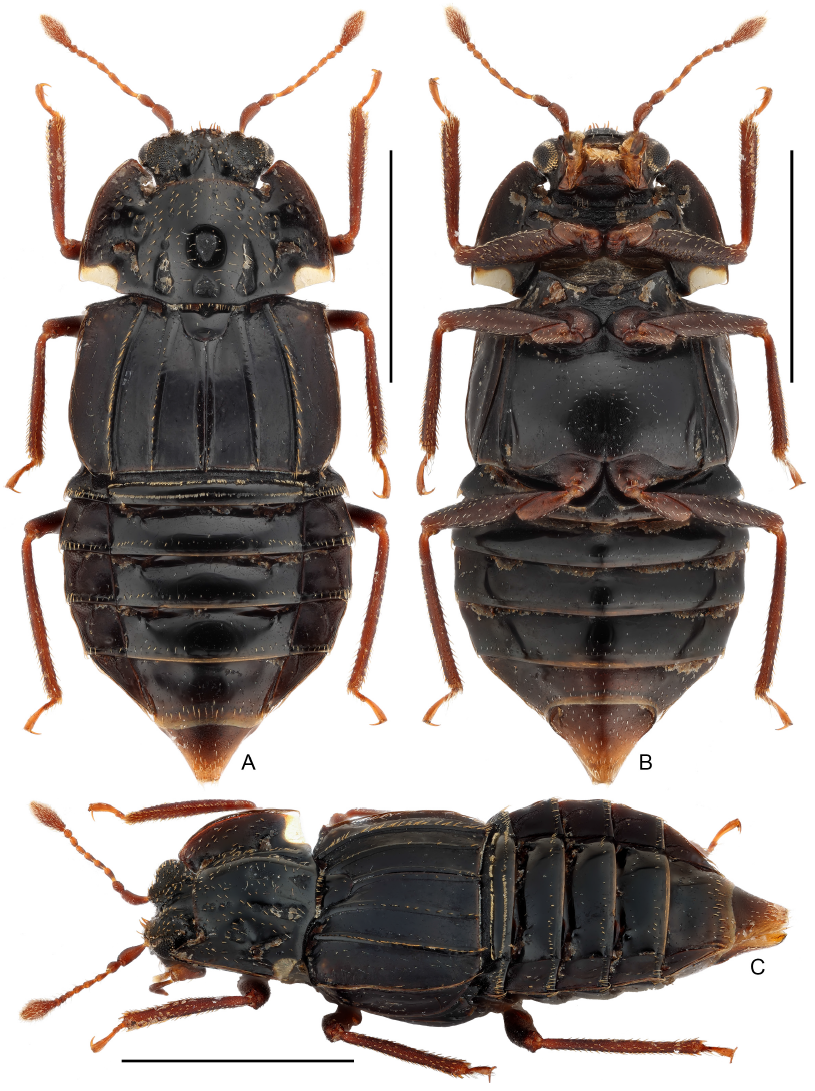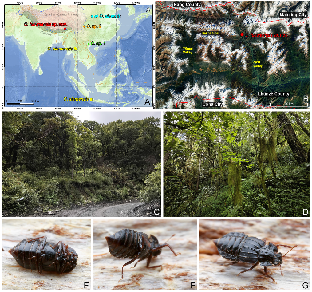 在此项研究中,殷子为研究员带领团队在西藏隆子县扎日沟地区发现了一种罕见的无脊铠甲属昆虫新种,并将其命名为珞瓦无脊铠甲(Cerapeplusluowaensis sp. nov.)。这一发现是无脊铠甲属在喜马拉雅山脉东段的首次记录,将该属的全球已知物种总数增加至三种。新种的发现大幅向西扩展了该演化支的已知地理分布范围,进一步提示了该物种对高海拔温带山地森林生境的偏好。
