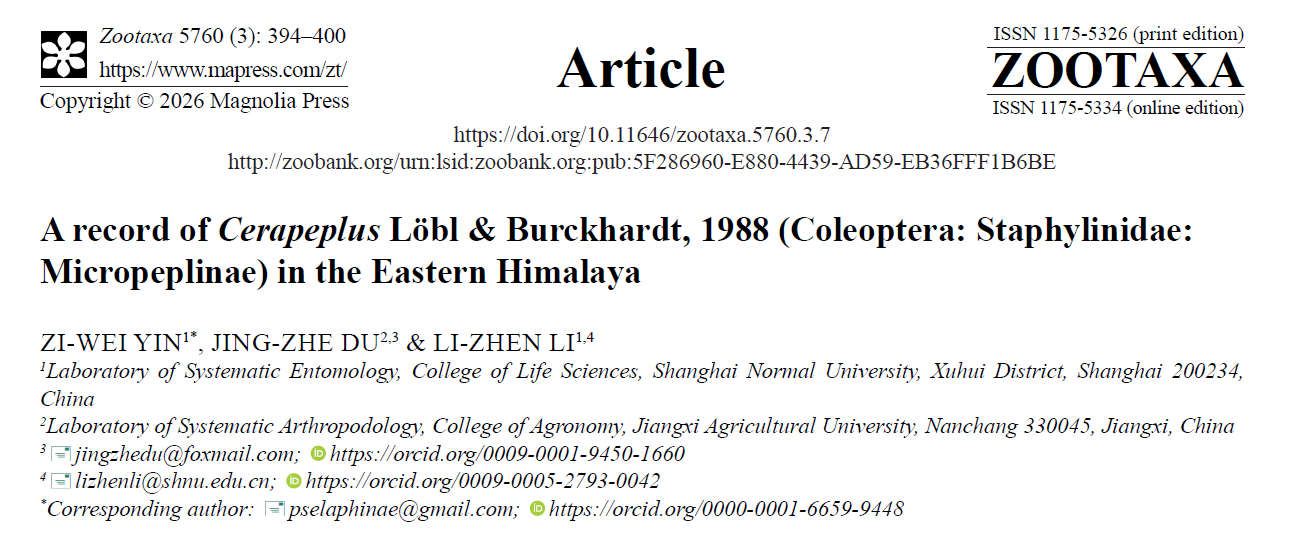 2月27日,新华社报道了OK138太阳集团系统昆虫学课题组联合江西农业大学和西藏自治区高原生物研究所在青藏高原生物多样性研究领域取得的最新进展。相关研究成果近日以“A record of Cerapeplus Löbl & Burckhardt, 1988 (Coleoptera: Staphylinidae: Micropeplinae) in the Eastern Himalaya”为题发表在国际动物学分类期刊Zootaxa。