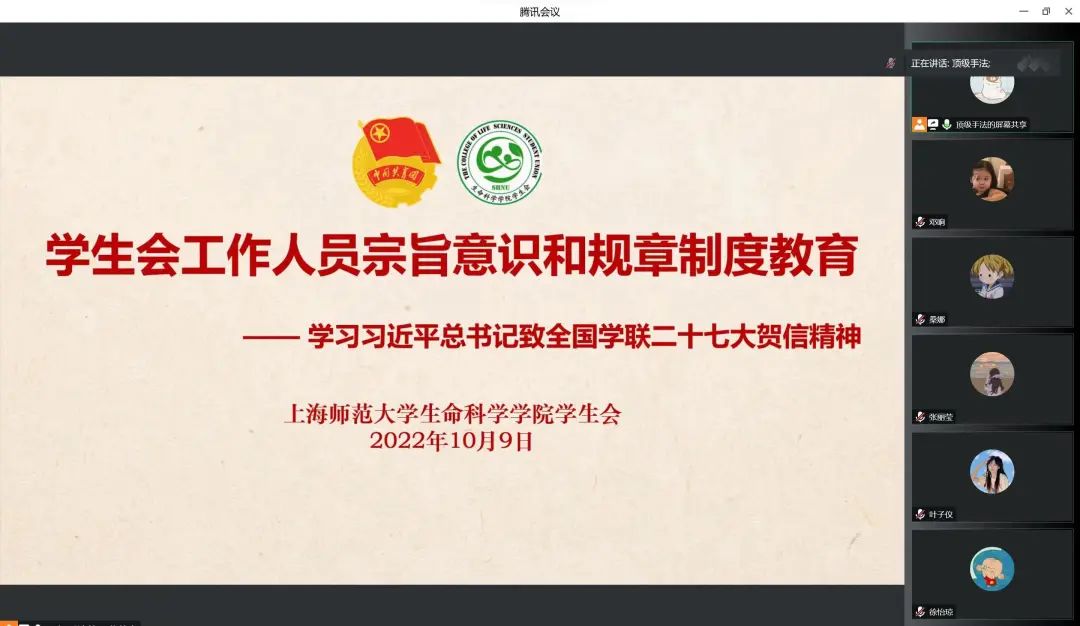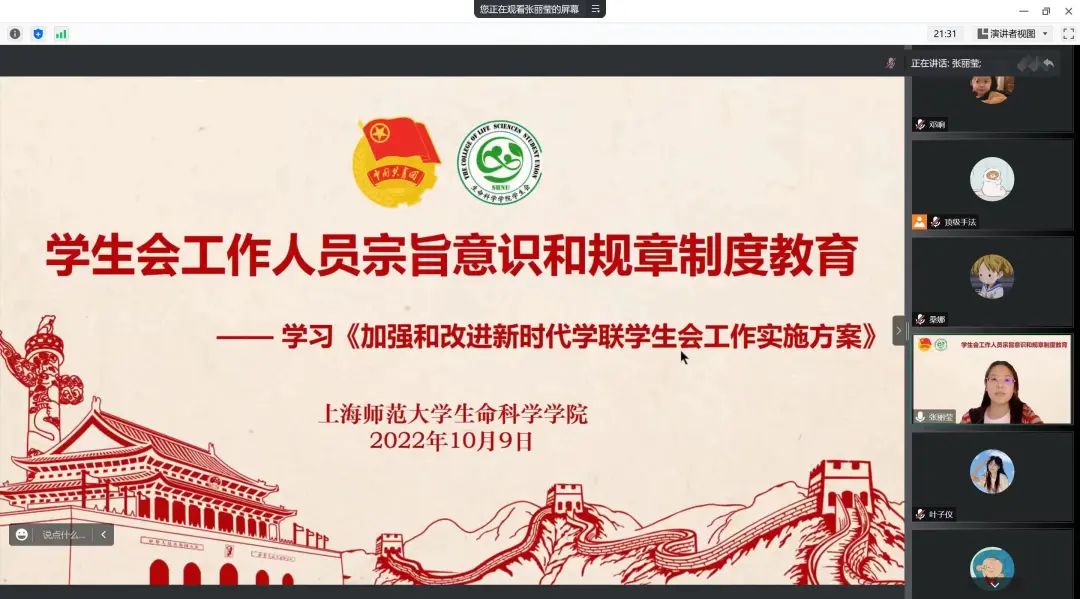 为深入推进学生会组织改革,严格落实学生会工作人员培训制度,加强学生骨干队伍作风建设,提高学生骨干综合能力素质,10月9日晚,我院学生会通过腾讯会议在线举行工作人员宗旨意识和规章制度教育专题培训。学院团委书记徐昊天老师主持会议,学生会全体工作人员参与学习。