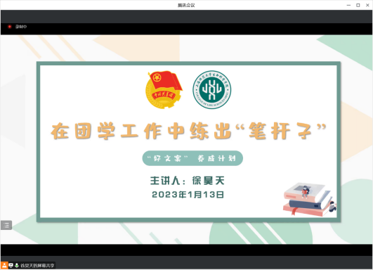 院团委书记徐昊天老师从“三能型团学骨干”入手, 强调了文字表达能力的重要性。他介绍了“文案思维”和“好文案”的标准,重点讲解了新闻稿的要素和结构,结合多篇新闻稿实例,分析了会议、活动和比赛等三类新闻稿的写作要点。通过带领同学们学习二〇二三年新年贺词,徐老师强调了“金句”的妙用,希望学员重在积累、勤在手头,多看多模仿、多写多交流,在学思践悟的过程中不断提升理论水平、业务水准、思维能力和大局观念。