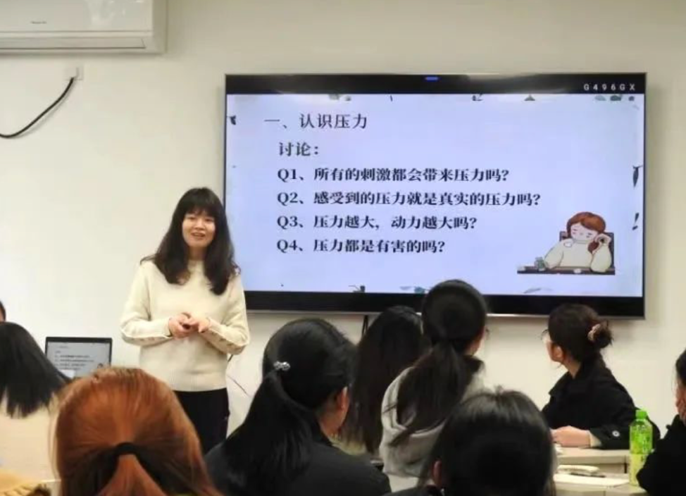 活动开始,苏帆老师请每位同学在纸上画出自己近期的压力圈,并同小组内同学互相分享自己近期的压力。随后,苏帆老师向大家进行了压力知识的科普,向同学们介绍了什么是压力,压力怎样产生以及如何应对压力。同学们首先要觉察压力,允许压力的存在;其次,去审视压力,运用理性思维和积极的自我对话进行认知重构,最后再通过放松技术、音乐减压、运动减压、艺术疗法等方式来调整情绪,处理问题。普及心理知识的同时也增加了同学们之间的互动交流。