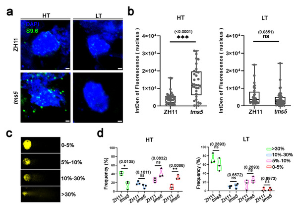 在分子机制方面,该研究提出了TMS5通过维持R-loop稳态调控温敏育性转换的新机制。R-loop是一种由RNA与DNA形成的核酸杂合结构,正常情况下参与多种生物学过程,但异常积累会损害基因组的稳定性。研究发现,高温条件下,tms5突变体中R-loop大量积累,并伴随DNA损伤信号增强和基因组稳定性下降,最终导致花粉败育。而在低温条件下,tms5中的R-loop水平明显下降,接近野生型,且植株育性恢复。进一步的实验表明,过量表达R-loop清除蛋白OsLS1可以部分恢复tms5的育性并降低其DNA损伤水平。这说明R-loop异常积累与tms5温敏育性转换不育密切相关。该研究进一步丰富了对TMS5功能的认识,揭示其在RNA代谢、R-loop稳态维持、基因组稳定性和花药发育中的重要作用。这项工作不仅加深了对tms5温敏育性转换机制的理解,也为两系杂交水稻不育系的优化改良提供了新的理论依据。