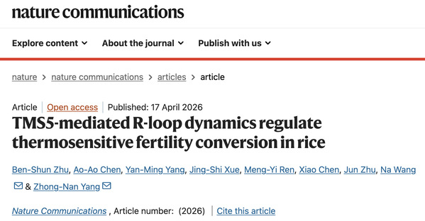 近日,Nature Communications杂志在线发表了来自ok138太阳集团/上海交通大学杨仲南团队题为“TMS5-mediated R-loop dynamics regulate thermosensitive fertility conversion in rice”的研究论文,该研究聚焦水稻两系杂交育种中应用最广泛的温敏雄性不育位点tms5,解析了其调控育性转换的细胞学基础与分子机制,为温敏不育系的精准改良提供了新的理论支撑。