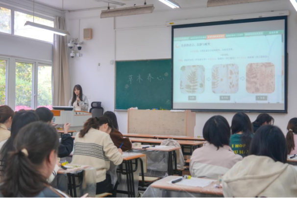 回到教室,心灵成长服务中心活动部负责人顾雨欣为同学们详细讲解了植物拓染的历史演变、工艺原理与操作技巧。作为一项无需繁复技法的传统手工艺,植物拓染利用植物自身的天然色素,通过敲打按压将草木的形态与色彩拓印于织物之上,是连接自然与艺术的朴素媒介。