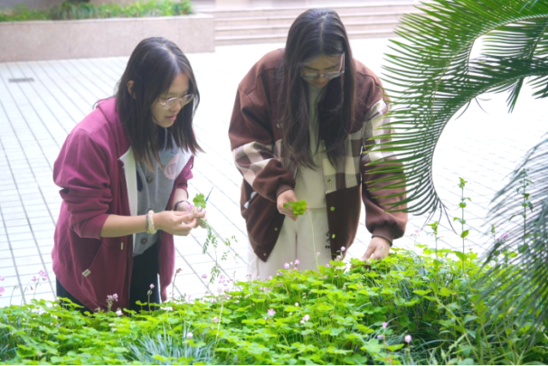 活动伊始,同学们漫步于校园各处,以身心感受找寻心仪的拓染素材。蕨叶、酢浆草、枫叶……这些平日里熟悉的校园植物,此刻成为了同学们手中珍贵的创作原材料。采集过程中,指尖抚过叶片锯齿边缘的微痒,掌心触碰花瓣水珠的清凉,鼻尖萦绕草木泥土的清新——触觉、嗅觉与视觉的多重感官刺激,悄然激活大脑体感皮层,帮助参与者与自然建立深度联结,神经系统随之从紧张趋向松弛。