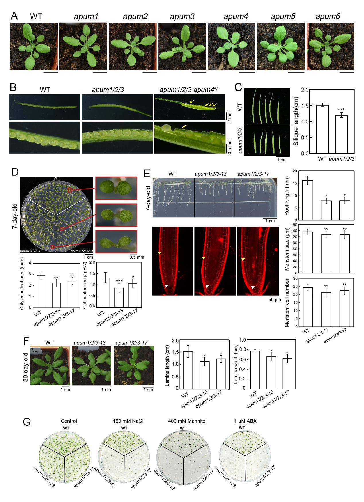 图1.apum123突变体生长受损并对胁迫条件敏感
