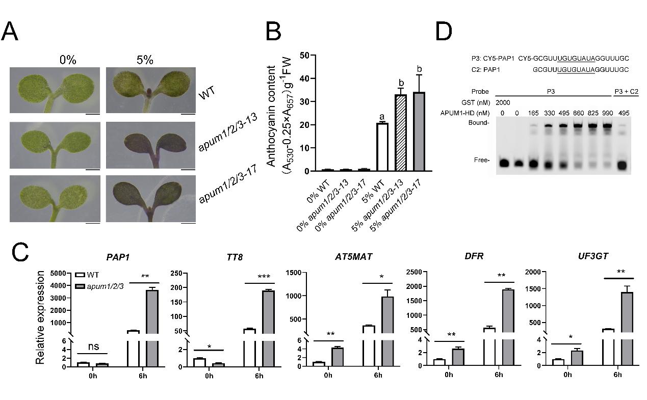 图2. APUM1特异性结合PAP1 mRNA的3'-UTR区域的保守基序从而调节花青素合成