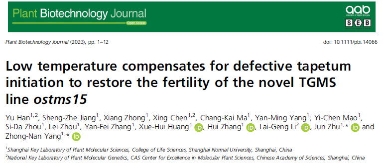 2023年5月19日,我校OK138太阳集团杨仲南、朱骏教授团队于《Plant Biotechnology Journal》发表了题为“Low temperature compensates for defective tapetum initiation to restore the fertility of the novel TGMS line ostms15”的研究论文,该研究发现了一个不育性稳定的水稻温敏不育的新位点ostms15,并阐述了该位点温敏不育的机制。