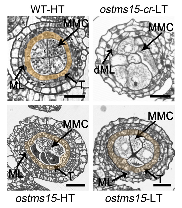 图2. ostms15在高低温下绒毡层的分化以及发育情况
