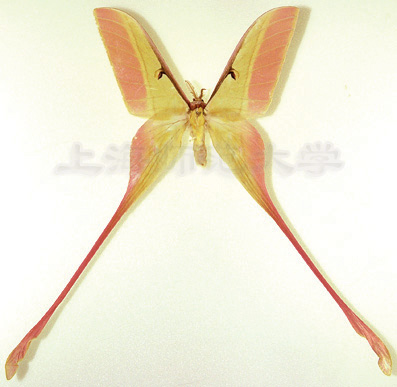 长尾大蚕蛾翅展90~110mm。雌蛾前后翅均为浅绿色,雄蛾翅的基半部黄绿色,端半部粉红色。
