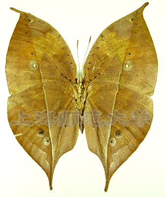 枯叶蛱蝶翅展70~75mm。翅正面紫褐色有光泽,前翅顶角尖锐,中域有1条宽阔的橙色斜带,反面酷似枯叶,是蝶类中的拟态典型。