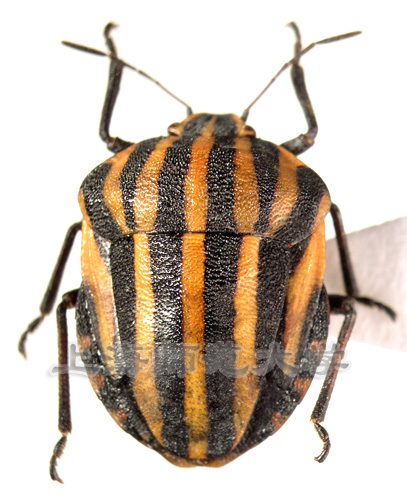 赤条蝽体长10mm。体近圆形,黑色,具橙红色条纹。