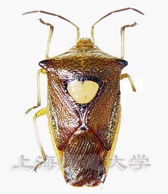 伊锥同蝽体长11~13mm。体黄褐色,小盾片上具1个黄白色心形斑,前胸背板后角突出。